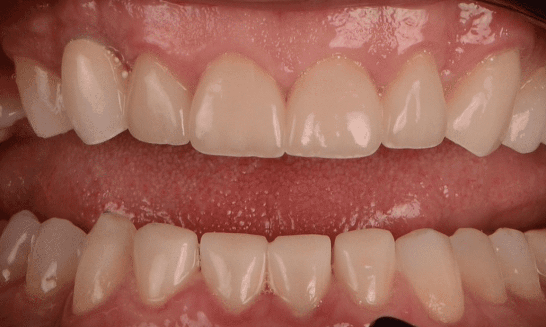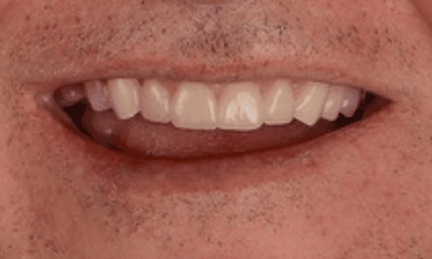 A combination of ceramic veneers, crowns and a dental implant was used to alter his bite and increase the size of the teeth. A soft tissue laser was used to reduce the gum around the top teeth tooth, this can allow for larger size veneers and better tooth shapes.